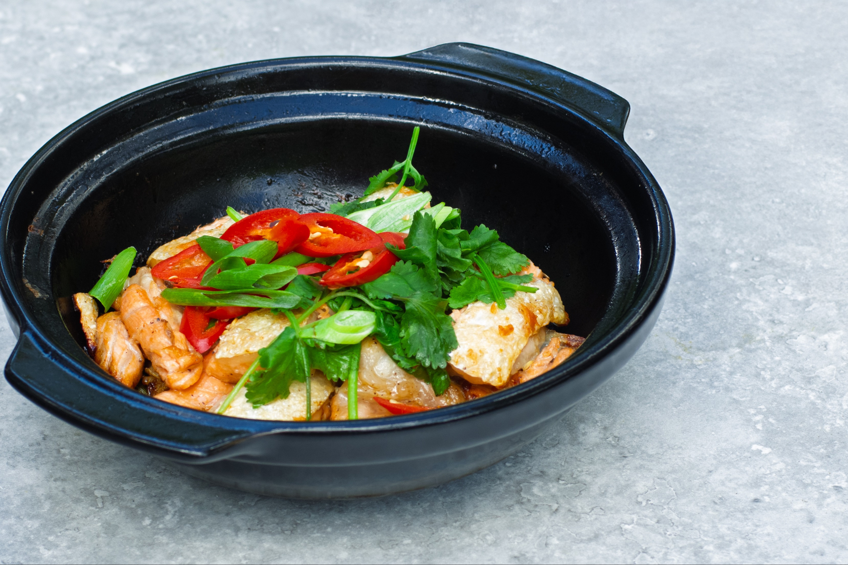 Crispy pan-fried salmon belly, gently steamed with ginger, garlic, and rice wine in a fragrant claypot. Rich, aromatic, and full of flavour.