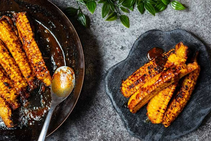 Indulge in these succulent corn ribs, generously coated with a delightful blend of miso and butter.