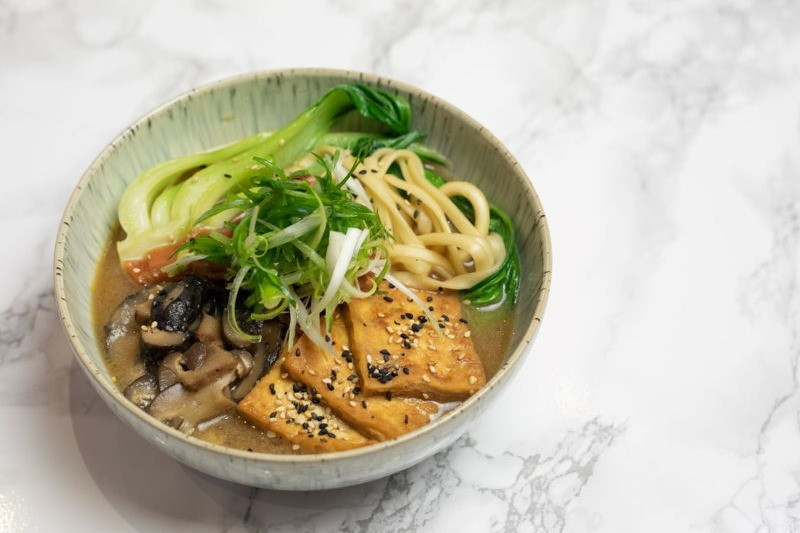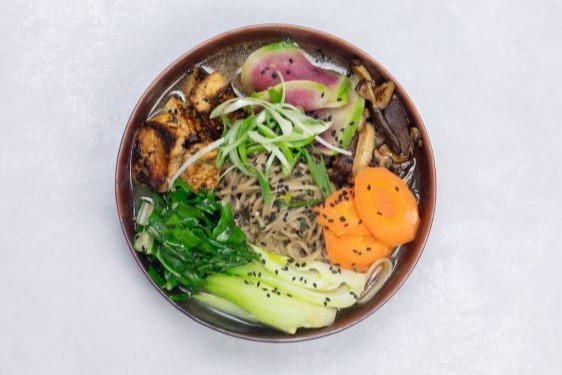 A vegan ramen recipe from Chef Jeremy Pang, using ramen noodles, fresh pak choi and miso-glazed carrots and tofu to make a vegetarian version of the classic Japanese noodle soup.
