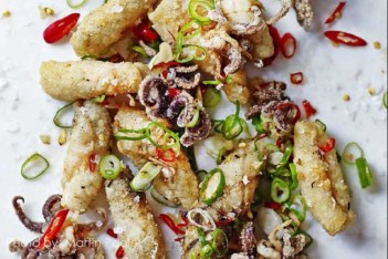 A tantalizing dish featuring tender, crispy squid rings seasoned with a perfect balance of salt and pepper.