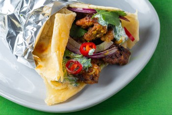 Deliciously buttery and flakey paratha bread generously filled with roasted spiced chicken thighs.