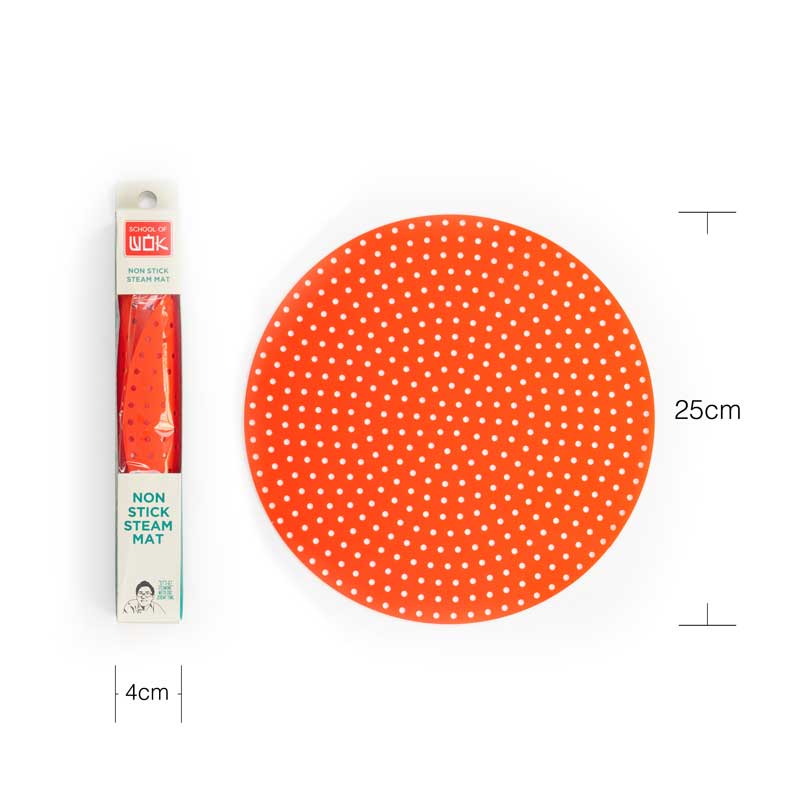 School of Wok’s uniquely-designed silicone steam mats prevent any sticking from your steamed dumplings, baos, or fillets of fish and meat. Easy to wash and entirely reusable, they are produced in the iconic School of Wok red and are the perfect fit for a 10” bamboo steamer.