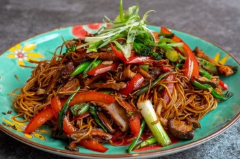 Deliciously crispy noodles, topped with fresh prawns and squid cooked in a tangy, spicy sauce.