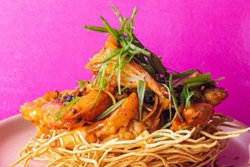 Succulent savoury prawns with classic Chinese flavours of ginger and spring onion - served in a 'bowl' of crispy noodles.