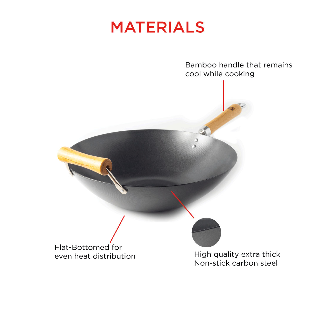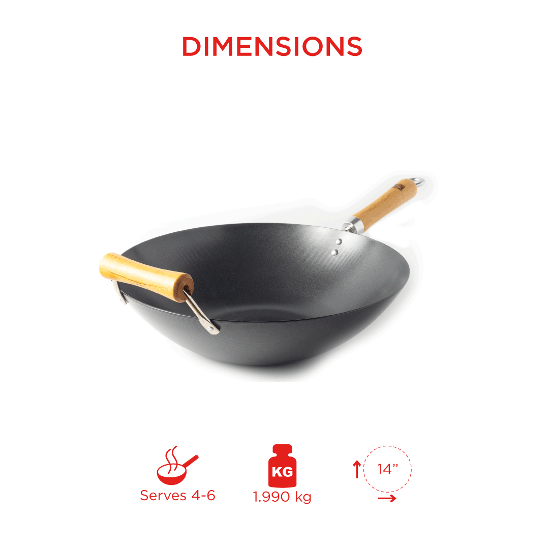 · Carbon Steel Material: Made from 2mm thick (2 gauge) non-stick carbon steel, this wok is built to last and perfect for stir-frying.